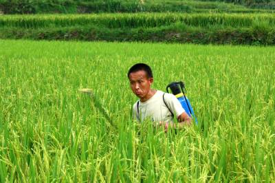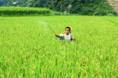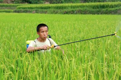 科学抗旱保丰收 8月11日,一农民在竹溪县水坪镇大石门村五组稻田里喷施无毒无残留作物细胞分裂素,促进水稻早分裂,增强抗旱能力。