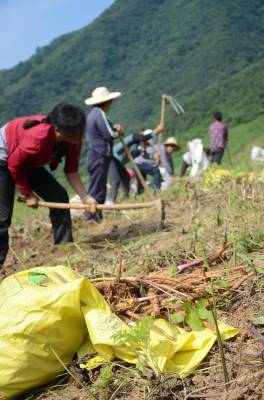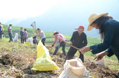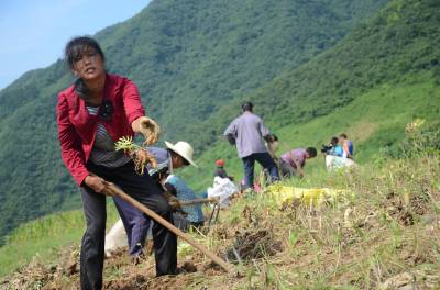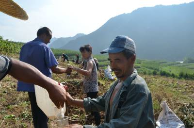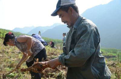 8月11日上午,热浪袭人,竹山县双台乡双台村的药田里,二十几位村民正在忙碌着。200亩的白芷成熟了,这几天正是收获季节。2012年,双台乡引进专营中药材种植和销售湖北神农本草公司,采取公司+基地+农户的经营模式,流转土地2000亩,种植白芷、芍药、决明子、夏枯球等多味竹山地区地道中药材。竹山县双台乡的药农们因为这些散发着浓郁香味的药材走上了致富路。(本报视界网 吴冠韬摄)15071611302
