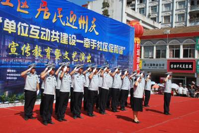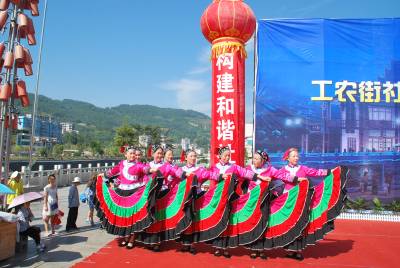 2013年8月12日,由中共宣恩县委宣传部、县文体局主办,宣恩县珠山镇工农街社区、宣恩县城管局承办的社区居民迎州庆,工农街社区“单位互动共建设——牵手社区促和谐”的宣传教育暨文艺演出活动,在宣恩县城河滨广场隆重举,县直各单位、珠山镇各社区群众参加了这一活动,现场并回答有奖知识问答题,教育人、启迪人,“携互动共建设,牵手社区促和谐”。图为“县城管局回答前来咨询的群众、县人民医院医生为咨询的群众免费检查身体量血压、珠山镇兴隆街社区表演的《土家织绵》等。