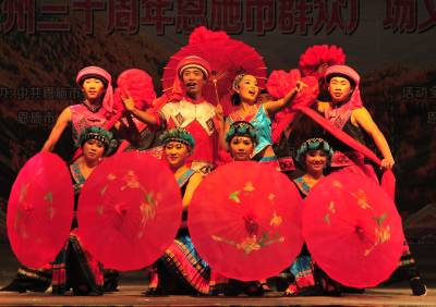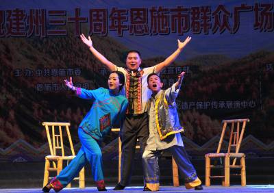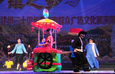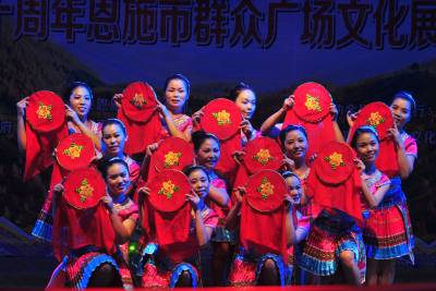 群众文艺汇演送来清凉风 8月12日晚,太阳河乡群众正在表演车车灯。 当天,恩施市乡镇办事处100多名“草根”演员齐聚州民族广场,庆祝恩施自治州建州30周年,为广大市民带来了清新宜人的文艺节目。现代灯戏《整酒》、车车灯表演、傩戏等节目,展示了新农村建设中的新风尚、新气象,给现场观众带去了一股清凉之风,获得大家的好评。 通讯员 谢顺 摄 恩施市新闻中心 谢顺 13277590198