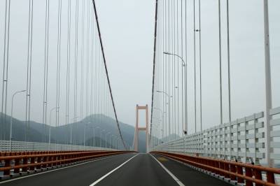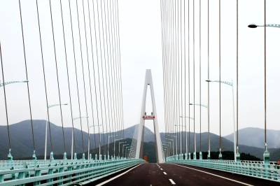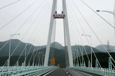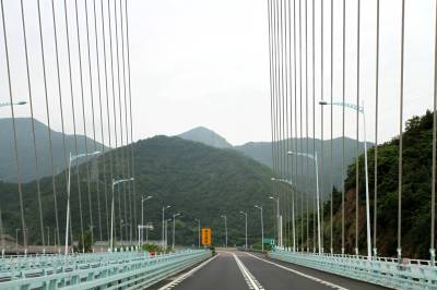 长途旅行坐在副驾行驶中拍大桥。