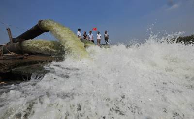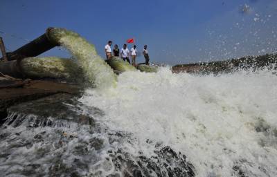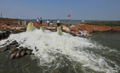 8月19日,在湖北省襄阳市襄州区石桥镇西排子河水库,大型抽水机全力抽水抗旱,保证周边农作物