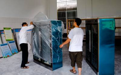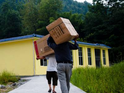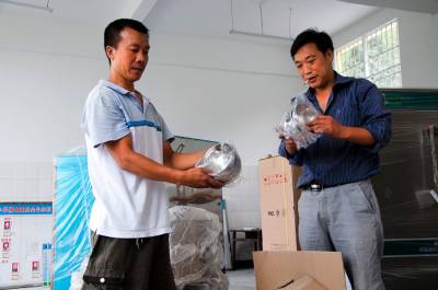 2013年8月19日,工人们正在石人坪小学搬运餐具到新建的学生食堂。为了抓好秋季学期的开学工作,咸丰黄金洞石人坪小学积极筹备,组织力量整理校内外环境卫生,做好开学前的各项准备工作。为按时开学奠定基础。图为;2013年8月19日,黄金洞石人坪小学组织力量搬运学生餐具到新建食堂。本报视界网 吴朝军摄 15347000296