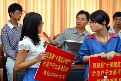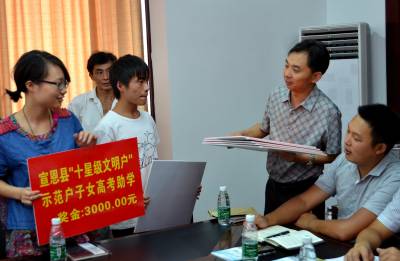 23日,高考学子正在接受助学金奖励。当天,宣恩县对15户“十星级文明户”示范户考上全日制二本以上大学的子女给予3000元的奖励。据悉,为推进新农村建设,该县大力实行“十星级文明户”评选活动,给予示范户汽车驾驶员培训补助、医疗优惠、子女优先应征入伍等优惠政策。 本报视界网 胡小军 摄