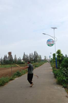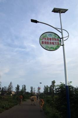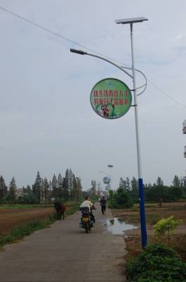 高悬在太阳能路灯上的内容各异的标语牌。2013年8月24日摄于云梦县城关西王社区村道边。户外标语,反映一个时期的政治、社会等生活,记录着一段历史,成为时代的印记、历史的一面镜子。本报视界网 陈保忠 摄