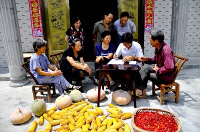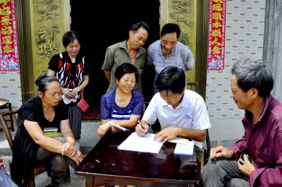 8月27日,在湖北省恩施市红土乡乌鸦坝村四合淌组,村干部正在入户代收“新农合”资金。