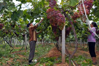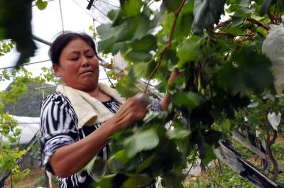 葡萄园里显身手 8月25日,来凤县大河镇新街村果农在“金秋农园”里培管葡萄。 两年前,该镇村民向辉成立来凤县果蔬专业合作社,以“合作社+基地+农户”为模式创办“金秋农园”,引进“红地球”“森田尼无核”“美人指”等新品种,通过无公害栽培等方式,有效提高了葡萄品质,深受消费者青睐。目前,该村60亩葡萄喜获丰收,吸引了恩施、宣恩、咸丰、来凤及当地许多客人前来该基地亲自采摘,其产品供不应求。(本报视界网潘家文)、