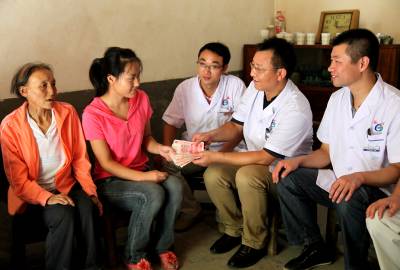 谷城县赵湾乡海拔1580多米青龙山上的姑娘万永欢,是湖北师范学院大四学生,9月1日要去学校报到,只因父亲患病、母亲乳腺癌晚期家无分文,连到校后生活费都无着落。谷城县医院内科党支部书记胡秀全获知情况后,立即发出为万永欢同学捐款倡议,从院领导到一般医务人员纷纷伸手相助。8月28日上午,胡秀全(右二)和内科同事一起驱车70余里把首期4000元现金送到万永欢(左二)手中,确保她继续上学完成学业。 谷城县城粉阳路33号(县宣传部)帅瑜 摄 (手机13972211958邮编441700)