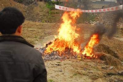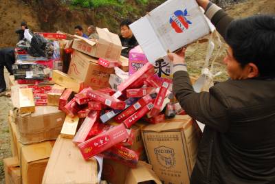 3月15日上午,秭归县公安、工商、烟草、质监四部门联手焚烧2009年查获的假烟。1059.6条假烟被付之一炬。