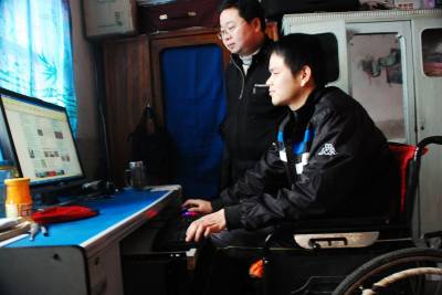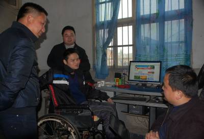 网上创业苦中乐。26岁的蕲春青年邓进5年前在外地打工时,因一次工伤事故导致腰椎脊髓受伤,下身瘫痪。但他身残志坚,自强不息,通过互联网搭建与外界的联系平台,自学成才学习网络知识,先后为10余家企事业单位提供网站建设、维护等技术服务,在网络世界实现自己的人生价值。图为3月15日,他与本地网友探讨网站建设技术问题。(本报视界网余立鹏摄)