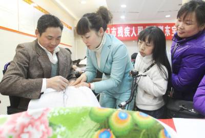 昨(16)日,在荆门市残疾人就业培训中心举办的技能培训班上,东宝区苏台社区残疾人杨书海在老师的指导下正飞针走线绣着手中的绣品。”玩十字绣可以锻炼耐心和细心,还能让我接近艺术,同时也能获得成就感。”健谈的杨书海说。当天,共有60余名残疾人参加了十字绣等技能培训。(本报视界网宁新生摄)