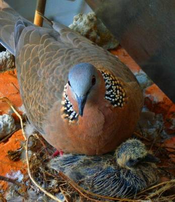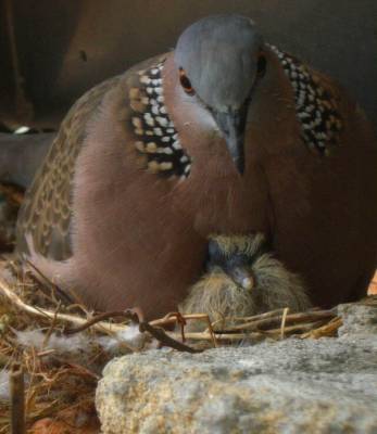 “嘻嘻,这是我家一对母子,小宝宝快一周了,真漂亮!”昨天谭女土再次用微博图文炫耀了一下,也流露出她心里难掩的喜悦。今天上午,笔者好奇来到她家,亲眼目睹了这对母子。斑鸠妈妈憨态可爱,颈部有一圈黑底白点毛,好似围巾,眼睛圆圆的,外围有一圈红光;雏鸟金黄色的胎毛夹杂着黑色羽毛,在妈妈的怀里探头探脑,煞是可爱。笔者拍照时,谭女土说:“快一点,尽量不要惊扰它们,还有一只没孵出来,好急人呢!”谭女土表示,她会一直关注这一家子,并精心照料它们,直到一只只小斑鸠展翅翱翔在秀美的红安上空,同时也希望广大市民能给鸟儿一个安全的“家”,看见、发现了也不要去打扰它们,这才是人与自然的和谐。本报视界网耿红元摄