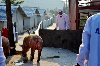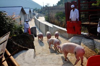 9月20日,恩施市三岔乡富邦万头生猪养殖场,在养殖场工人的引导下,第一批种猪正走进猪舍。当天,该养殖耗资近70万元从武汉安渡养殖场引进的原种种猪221头顺利进场。