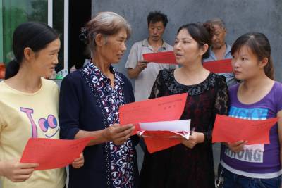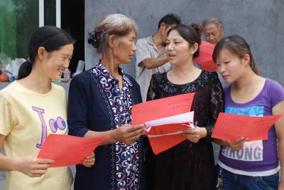 9月22日,竹山县城关镇财政所副所长、驻村专管员刘朝云(左二)到莲花8组张友福家发放2013年度《湖北省农民负担及补贴政策监督卡》和《县政府致农民朋友的公开信》,现场解答农户的疑问,宣传惠农政策。至此,该镇3000余户“监督卡和公开信”已全部发放到户。9月份以来,该县17个乡镇财政所为把农民负担及补贴政策监督卡及“公开信”及时发放到农民手中,采取分片包干,责任到人和送卡上门等措施,使全县10万农户足不出户喜领政策监督卡及“公开信”,深受农民欢迎。