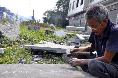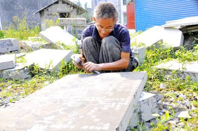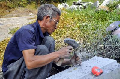 9月20日来凤县旧司镇花甲老艺人刘术珍正在为本县大河镇黑家坝村田氏已世老人雕刻碑文。