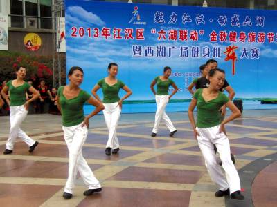 9月23日,2013年江汉区“六湖联动”金秋健身旅游节开幕式暨西湖广场健身排舞大赛,在汉口西北湖全民健身广场举行。来自北湖等12条街道妙三等百余个社区的西北湖等30个排舞队参加了比赛。通过一个多小时的规定舞曲和自选舞的两轮排舞大赛,民族街万年社区荣获了此次比赛的第一名。