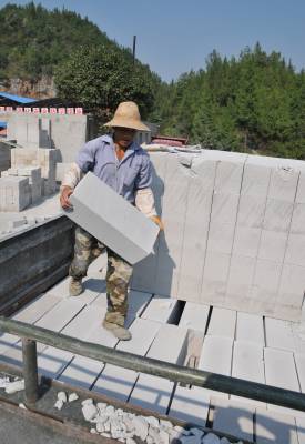 9月22日,在巴东县溪丘湾乡晟鼎建材有限责任公司,(图一)机械正在作业,(图二或图三)工人师傅将一口口环保沙砖运往各个建房工地。 2011年5月,汪毓杰注册资金500万元,成立了晟鼎建材有限责任公司,并投入1500万元购买设备,利用砂、石、粉煤灰、煤渣、煤矸石、建筑垃圾等废料,生产加气混凝土砌块灰沙砖新型墙体环保材料,有利废、轻质、大块、保温、隔热、防火、抗震等功效。该公司于今年6月20日试生产以来,订单接二连三。预计正式投产后,年生产能力10万立方米,每年可实现产值2000万元。(本报视界网 梁勇 摄)
