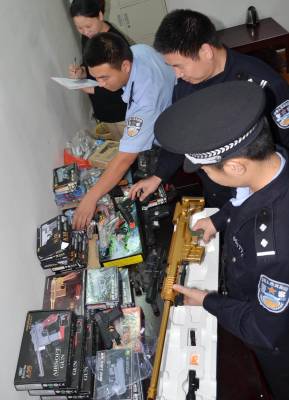 9月24日上午,保康县公安局城关派出所民警在辖区开展治安检查时,发现一玩具店内有47把仿真枪出售。这些仿真枪子弹射程在50米,部分枪支可以打钢珠弹丸,极易伤人。仿真枪易给青少年人身安全造成伤害,是法律规定禁止销售的产品,一经查获将处以没收、罚款,情节严重的可以处以治安拘留或刑事处罚。图为民警正在查验收缴的仿真枪。(欧阳智慧 /摄)