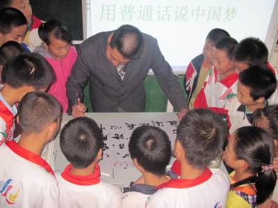 9月25日,郧县高庙九年一贯制学校魏老师正在为学生书写中国梦。9月第三周是全国第16届推广普通话宣传周。本届“推普周”活动宣传主题是“推广普通话,共筑中国梦”。郧县白桑关镇开展内容丰富、形式多样的推普宣传活动,用普通话讲述中国梦,用规范字书写中国梦。本报视界网王小虎摄