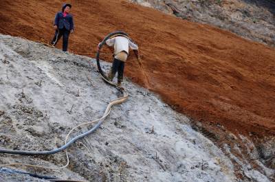 客土喷播就是将植物的种子、土、有机质、速效肥料、保水剂等按一定比例混合,利用高压设备喷射到经过加固处理的岩石边坡表面,其生长的草和灌木能够在岩石边坡等难以绿化地段实现快速绿化,是依靠基质、锚杆或锚钉、铁丝网(或塑料尼龙网)与植被的共同作用对坡面进行防护的一种喷播绿化技术。