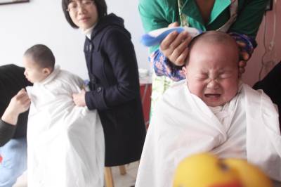 昨(17)日,是中国传统节气二月二龙抬头,荆门城区一家婴幼儿理发店一大早就迎来了小顾客,当日共为60多名婴幼儿理了发。家长们称,选这天来理发,只为取”龙抬头”之意,祈求孩子能有好运。(本报视界网宁新生摄)
