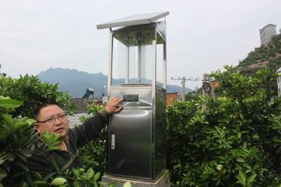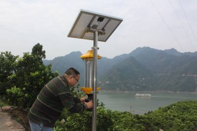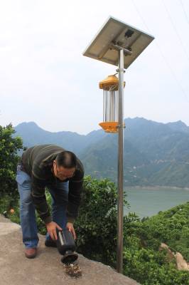 太阳能频振式杀虫灯是现代杀害虫的新式武器,形似“作战台”,故以“脐橙果园里岗哨”命名,它是根据害虫的习性而设计,高压电击杀属物理方法,对害虫具有较强的趋光、趋波、趋性的特性,引诱害虫扑向光源,光源外置高压电网,高压电网缠绕在灯管周围能将飞来的害虫杀死或击昏,以达到防治害虫的目的。它具有清洁、安全、无污染的特点,对人畜无危险,是典型的环保型能源。它不仅减少了农药残留,而且还大大提高了脐橙水果品质,维持了生态平衡。归州镇现有三个村全覆盖安装有不同型号太阳能杀虫灯,如:向家湾60盏,彭家坡61盏,屈原庙108盏,每盏灯可以控制50亩果园面积。图为秭归县归州镇农特中心主任胡开新检查杀虫情况。