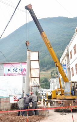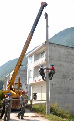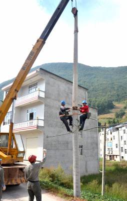9月26日,巴东县官渡口镇供电所工作人员正在火峰村栽高压电杆。该镇电力网改升级首期工程在火峰、殷家湾启动,对高、低压电杆、电线、变压器等器材全部更换升级,预计投资110万元左右。