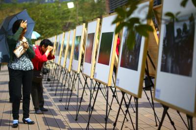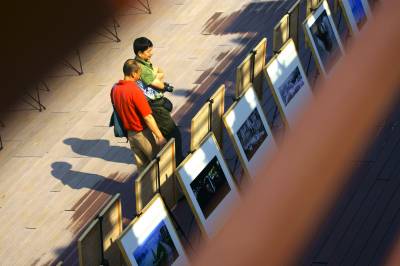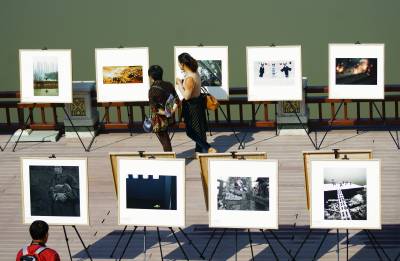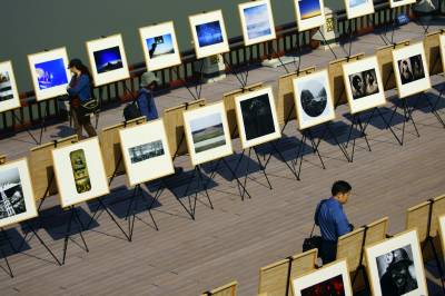 9月28日,市民在摄影艺术展上欣赏摄影作品。当日,第五届宜昌市摄影艺术展开展。本次展览共展出摄影作品250幅,展览共分纪录、艺术及获奖作品三大类 ,涵盖新闻摄影、专题报道摄影、社会人文纪实摄影、自然纪实摄影、人文景观、民俗风情、人物、静物、动植物、创意影像、观念影像、实验性影像等,是宜昌历届展览规模最大的一次。本报视界网 周建平 摄