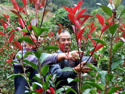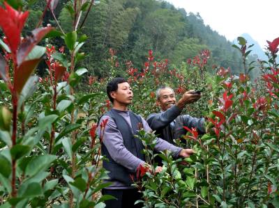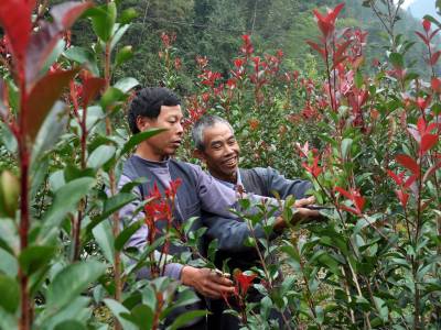 10月4日,来凤县革勒车乡陈家沟村1组村民田明珍(右)与村民一道在为红石叶楠剪枝。红石叶楠是蔷薇科石楠属杂交种的统称,为常绿小乔木,株高4-6米,叶革质,长椭圆形至倒卵披针形,春季新叶红艳,夏季转绿,秋、冬、春三季呈现红色,霜重色逾浓,低温色更佳。做行道树,其杆立如火把;做绿篱,其状卧如火龙;修剪造景,形状可千姿百态,景观效果美丽,经济效益可观。