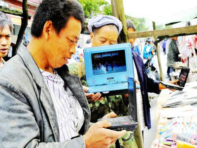 10月2日湖北来凤县大河镇的村民在选购移动电视和土家摆手舞光碟,以作教习子孙之用。