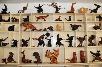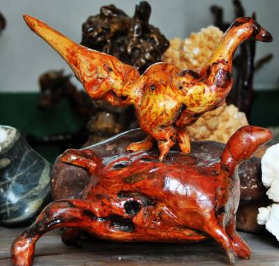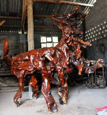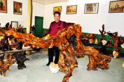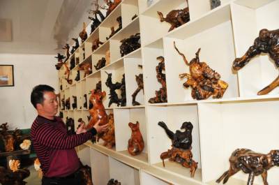 朱玉璋,郧县南化塘镇化山村4组村民,今年43岁,别看他个头不高其貌不洋可他有着不一般的生财之道,和与众不同的思维。他种过地,打过工,做过小生意。可他最终的选择还是返乡经营,把眼光对准了每年冬季村民们挖回树根烧火烤火的树根上,经他选中收购回来的树根经过加工修整竟变成了栩栩如生的各种动物造型的工艺品,经过城里销售生意挺好,他就越发喜爱上了根雕工艺这个行当,开办加工根雕的工作室和展厅,让顾客现看加工过程和在展厅里挑造根雕作品,使他这项变废为宝的生意越干毧红火,许多专家也到他的工艺室指导加工。