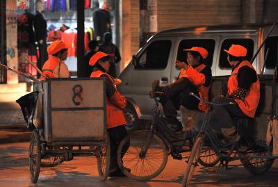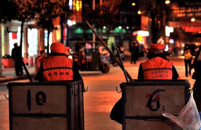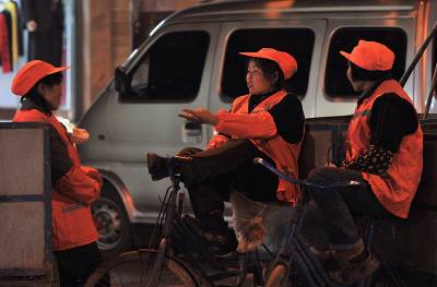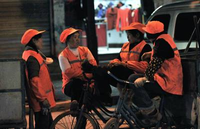 3月17日晚,宣恩县街头几名劳作之余的环卫工人。城市的每个角度,都生活着许多环卫工人,她们每天起早贪黑,为市民提供舒适的生活环境。视界网签约摄影师:宋文。