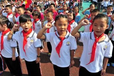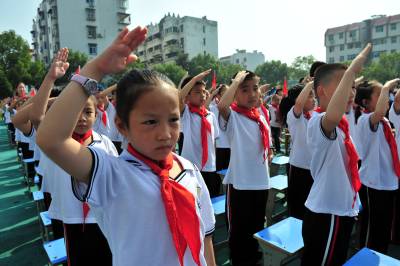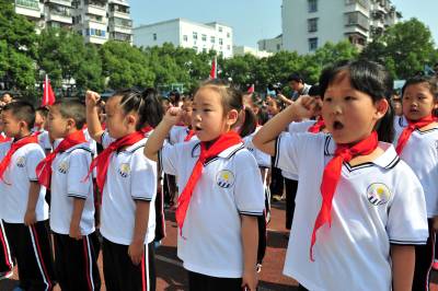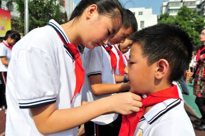 当日,秭归县庆祝中国少年先锋队建队64周年活动在秭归县实验小学举行, 150多名新队员戴着红领巾在队旗下宣誓、向队旗敬礼,光荣加入中国少年先锋队。视界网王辉富、王勇 摄