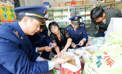 10月11日,保康县工商局城关工商所执法人员在县城区沿河路农资门市部检查种子质量。