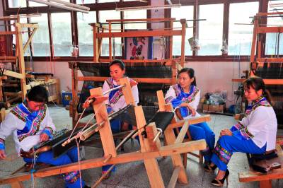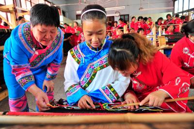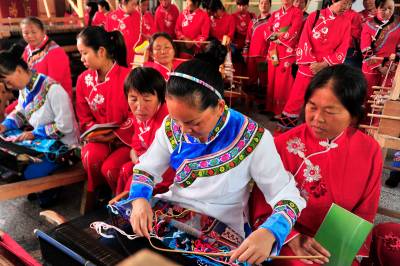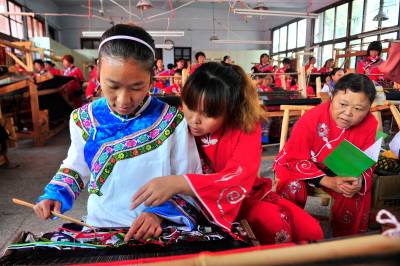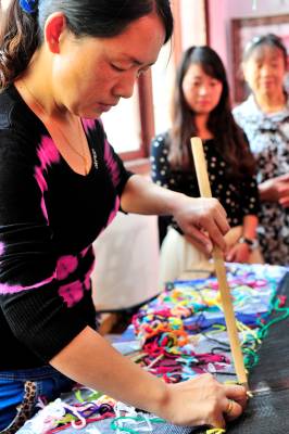10月11日,来凤县数名妇女围在一起学习“西兰卡普”土家织锦手工编织技能。