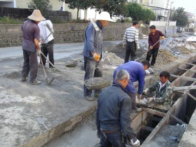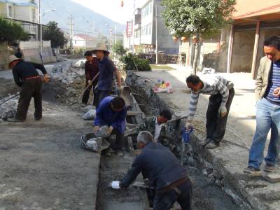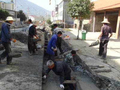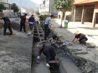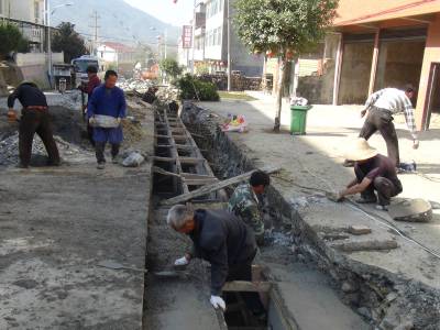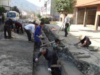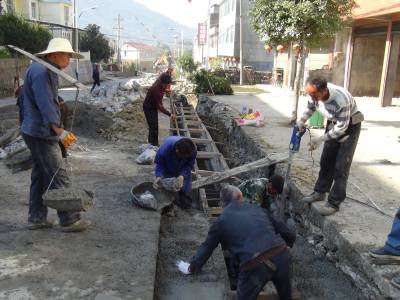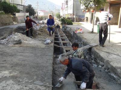 10月10日,鹤峰县走马镇北镇村新村建设工地上,工人们正在抓紧时间修建下水道。据该镇项目负责人介绍,该工程是2013年农综开发项目,总投资200万元,在街道中心建下水道1400米,3850米村级主干道全部黑色化。