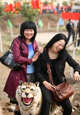 老虎”赶集”3月18日,在随县尚市镇桃花节开幕式上,该镇农民将一只老虎模型搬到了节庆现场,引得众多游人和老虎亲密接触。随州日报孙洪涛摄