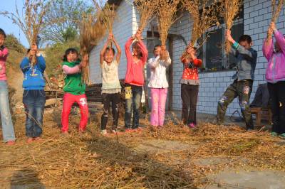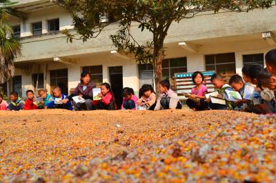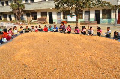 同日,湖北省郧县柳陂镇黎家店村教学点把语文《锄禾》课堂搬到了晒粮场——苞谷晒场,通过老师给学生讲解苞谷播种、管理的艰辛,背诵《锄禾》诗句,使孩子们懂了“粒粒皆辛苦”的道理,学会惜粮爱粮。