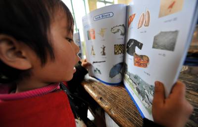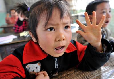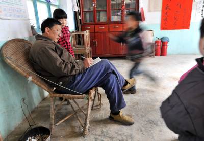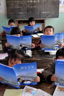 18日,宣恩县高罗乡小茅坡营小学的8名一年级学生在学校唯一的一名老师、也是苗语教学权威冯万清的领读下,一边用手比划、一边大声用苗诵读”一、二、三……”。小茅坡营村是湖北省唯一的苗族文化村,也是唯一用汉语、苗语”双语”教学的学校,但随着外出务工人员增多,在村子里读书的孩童越来越少,苗语的传承已越来越艰难。面对此种情况,该乡党委书记覃正彪说:县、乡两级将在本学期结束时,考虑合并这所学校,将冯万清老师安排在附近一所完小,负责教更多孩子学苗语。(视界网签约摄影师宋文、杨顺丕)