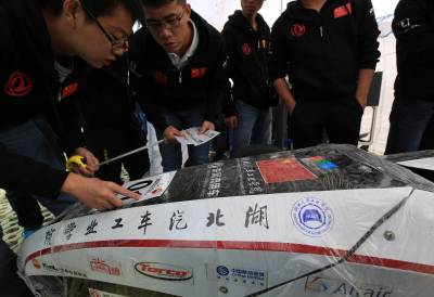 10月15日,在湖北省襄阳市襄城区贾洲,参赛的大学生们在观摩德国斯图加特大学的赛车。当日是2013年大学生方程式赛车大赛的车队签到日,截止到当日17时,今年的比赛已有来自全国各高校的60支车队到达赛场,参赛队伍和规模超过了往届。 2013年第四届中国大学生方程式汽车大赛将于10月16至19日在湖北襄阳进行总决赛。本届比赛报名车队达到82支,组委会批准63支车队参赛。参赛赛车大多由在校大学生们设计、制造、调试。