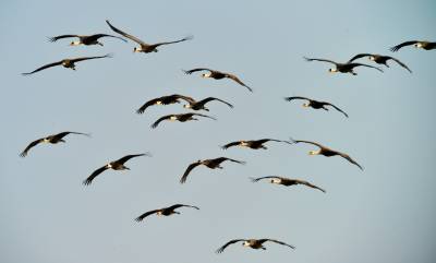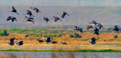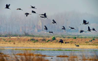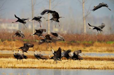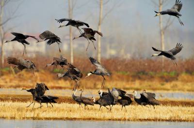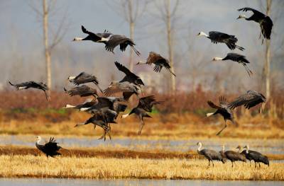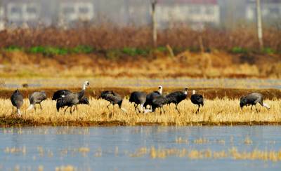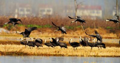 湖北省黄梅县,2005年被中国野生动物保护协会评为“中国白头鹤之乡”,自1986年有观测记载以来,国家一级保护鸟类白头鹤每年都来黄梅县龙感湖越冬,种群数量最多时达到500余只,是我国迄今发现最大的越冬种群。这些白头鹤栖息在该湖区的休耕稻田里,以稻田中的植物为食。前些年,农民将稻田变成了棉花地,并在那里种上意杨,白头鹤的家园受到严重破坏,许多白头鹤改而飞到长江下游湖区栖息,有些年份龙感湖见不到白头鹤。近几年当地有关部门采取措施,让当地农民调整产业结构,让棉花地重新变成水稻田,白头鹤又回来了。黄梅县境内龙感湖自然保护区鸟类资源丰富。通过近20年的跟踪观测,发现鸟类164种,其中国家一级保护的5种,二级保护的23种。白头鹤在西伯利亚、乌苏里江流域繁殖,在长江中下游越冬,野生数量7000多只,已列入世界濒危物种红皮书。它高1米左右,体重约3.5公斤。这是去年12月到今年3月间拍的片子,有近50只,希望今年冬天有更多的白头鹤回家!