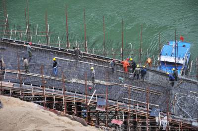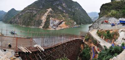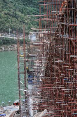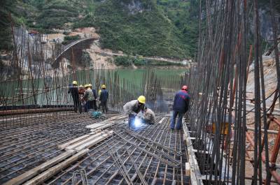 10月16日,四川路桥公司工人正在小溪河大桥东、西两侧桥拱扎钢筋、筑拱。 小溪河大桥位于巴东县官渡口镇南岸的肖家坪、马鬃山两村交界处,横跨长江一级支流小溪河,是国家三建委交通个案投资和三峡库区移民复建工程重点项目。桥长218.5米、宽8米,计划投资2321.9万元,工期608天。主桥为上承式钢筋混凝土单箱三室双肋闭薄壁箱型拱桥,采用有平衡重转体施工,净跨径155米,是恩施州目前最大的在建转体桥。工程自2012年10月10日开工建设,力争今年年前合龙,明年10月建成通车,从而贯通湖北与四川沿江交通枢纽线。(本报视界网 梁勇 摄)13986846069