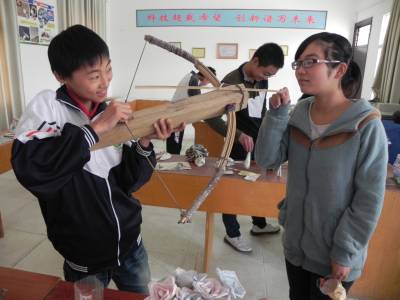 “秀秀”我的小创造 10月21日,十堰市郧县青曲镇初级中学学生魏强在向同学介绍自己设计的弓箭。当日,该校举办了学生实践与创新技能大赛展示活动,共展出小制作、小创造作品300件,调动了学生探究科学的兴趣,培养了创新精神和动手能力。 (本报视界网 张传郧 摄)
