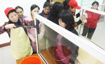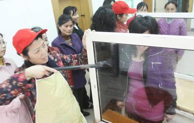 月嫂们正在进行擦玻璃技能比拼。昨日,荆门市东宝区泉口社区活动室内热闹异常,一场别开生面的月嫂技能大比拼在这里举行。来自辖区的20多名月嫂进行了烹饪、护理等技能的比赛。(本报视界网宁新生摄)