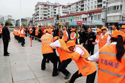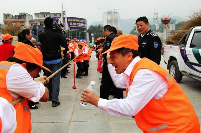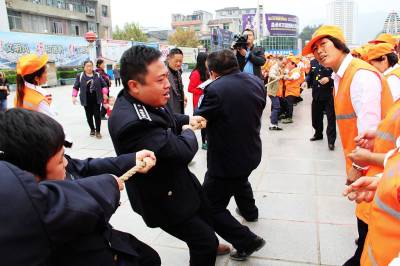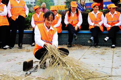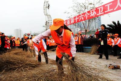 宣恩环卫工人快乐过节 10月23日上午,宣恩县环境卫生管理所的环卫工人门正在河滨广场参加扎扫帚、拔河等多项趣味比赛。据悉:10月26日是湖北省今年第十六个环卫工人节。为庆祝这一节日的到来,活动当天,全所有近200名环卫工人过上了一个快乐节日。 (本报视界网:罗清峰摄)