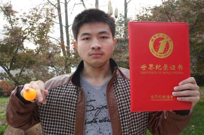 提到申报世界记录,他告诉笔者,今年3月11日开始向世界记录协会提出申请,3月19日拿到初审通知书,“9月27日获得复审通知书,我当时拍了一段视频,制作成光盘,然后找学校开证明,寄给了世界记录协会,不久前成功拿到了世界记录证书。”