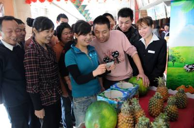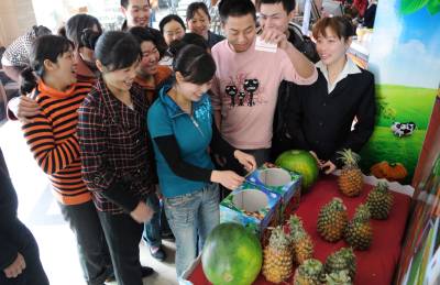 19日,几位年轻人在一丁甜酒大厅里玩”偷菜”游戏。为了吸引顾客,该酒店把网络上流行的”开心农场”做成现实版,供顾客体验。酒店方把菜品做成卡片,免费送给顾客”种植”,过了成熟期不及时消费掉,就把卡片放在盒子里,供其他顾客随机”偷取”消费。