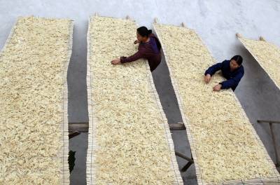 图片说明:1、工人正在晾晒豆丝。