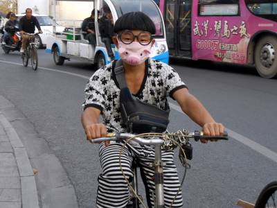 > 武汉帅小男孩用猪八戒面罩防秋燥雾霾