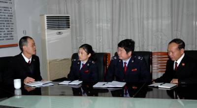 图一:方波(左一)在与分局党支部书记郑卫斌(右二)、局长尚丽(左二)进行预防腐败警示教育。